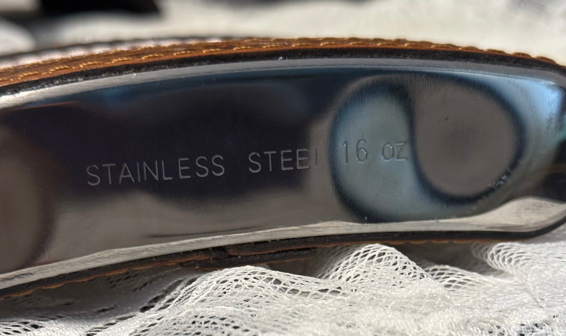 Genuine tooled leather flask with western stitching, stainless steel, 16 ounces.