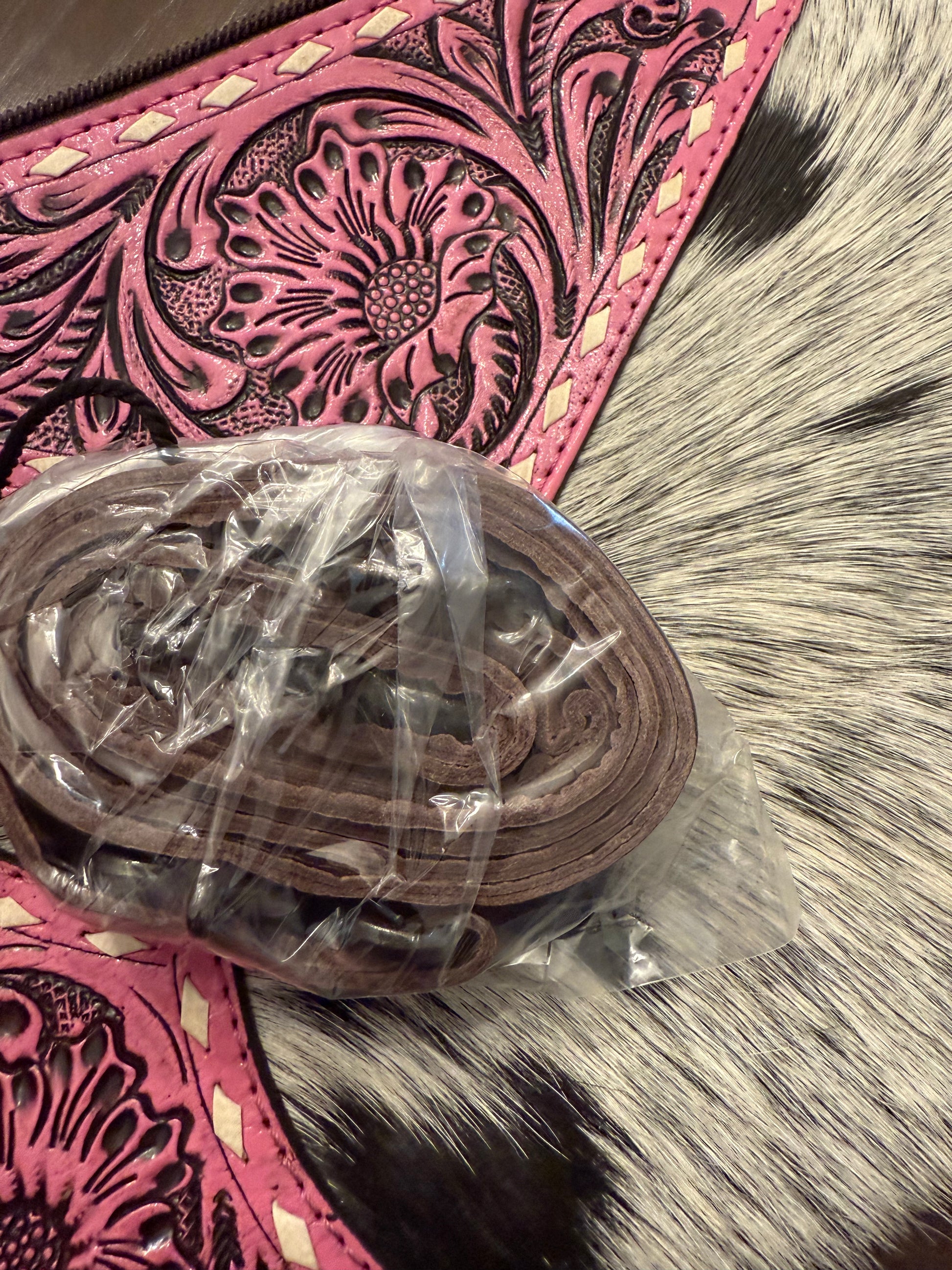 This Pink Tooled Leather & Cowhide Crossbody Bag is a stylish and functional accessory. Made from premium pink tooled leather and cowhide, this bag is durable and fashionable. The crossbody design offers hands-free convenience, perfect for everyday wear. Stay organized with multiple pockets and compartments.