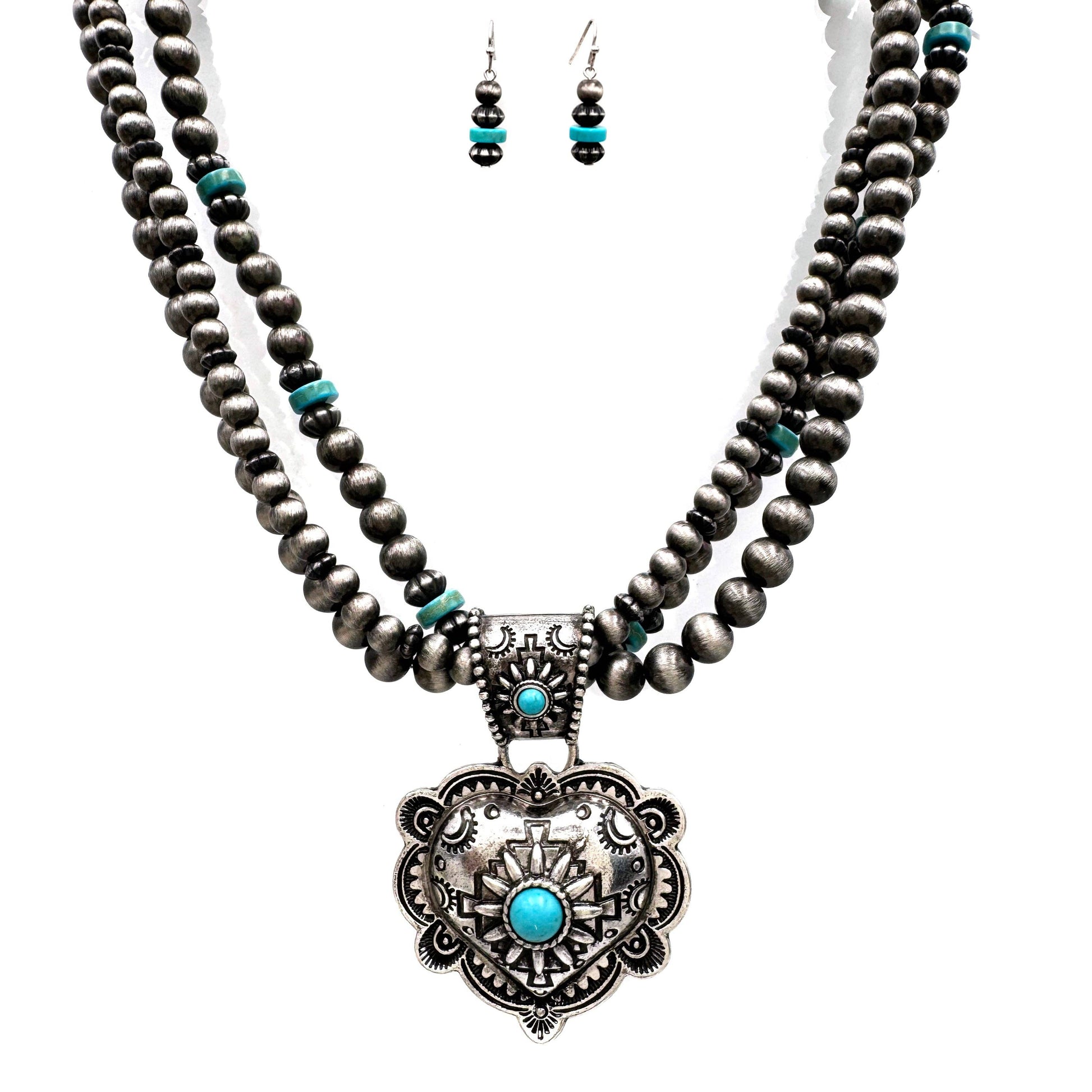 Indulge in the iconic style of the Wild West with our Silver Western Heart Navajo Turquoise Necklace Set. Crafted with stunning silver and adorned with a vibrant turquoise centerpiece, this set adds a touch of boldness and elegance to any outfit. Embrace your inner cowgirl and make a statement with this remarkable set.