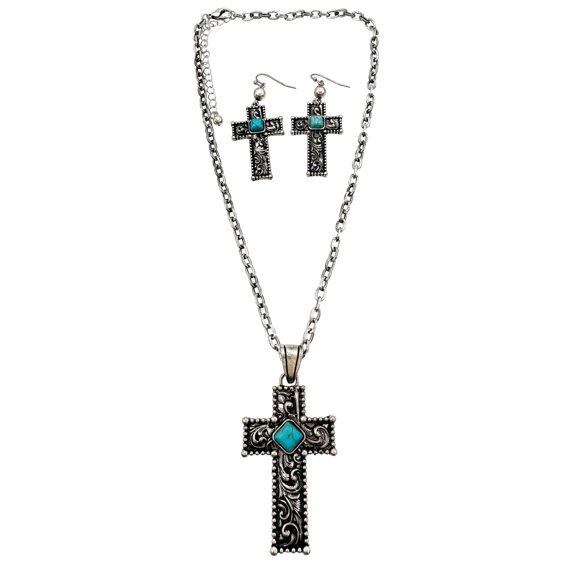 Western Cross Turquoise Filigree Necklace Earrings Set
